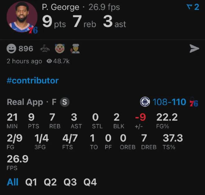 全场比赛,乔治首发出战21分钟,贡献9分7篮板3助攻2封盖,只出现1次失误,看上去真的挺不错的。